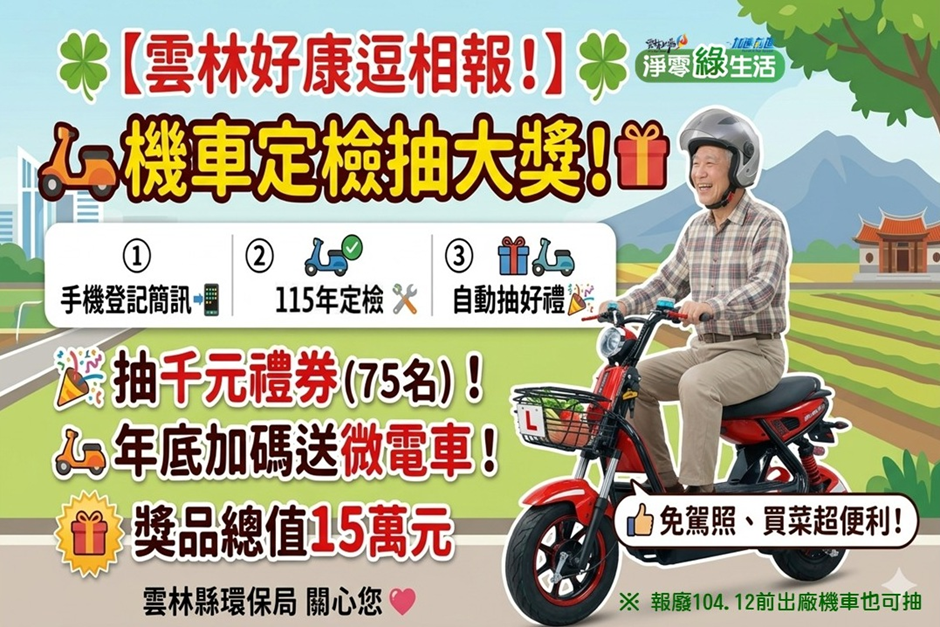 環保局表示設籍於雲林縣的機車車主,僅需於專屬網站完成車號與手機號碼登錄,並如期完成年度排氣定檢,即可自動獲得抽獎資格,該活動採取分階段抽獎模式,預計於7月與12月分別抽出共75名幸運民眾發放千元禮券;此外,針對環保貢獻與汰舊換新,凡於今年11月底前完成老舊機車(104年底前出廠)車籍報廢的車主,除可申請既有的汰換補助外,今年更首度納入年度加碼抽獎行列,有機會獲得微型電動二輪車。