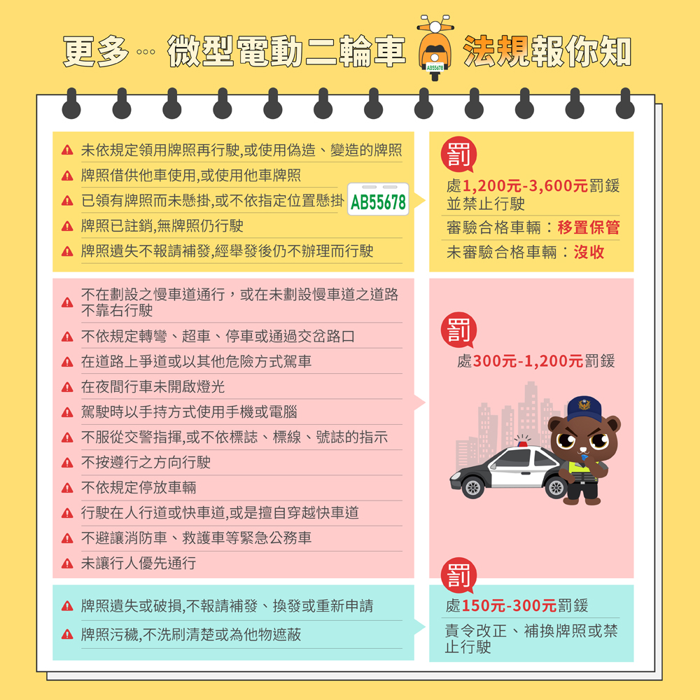 過也微型電動二輪車沒有規定要掛牌,一旦發生交通事故都難以追查與開罰。現在已全面規定,微型電動二輪車要完成掛牌及投保強制險才能上路,逾期未依規定領用牌照行駛,就可以開罰1,200到3,600元罰鍰。