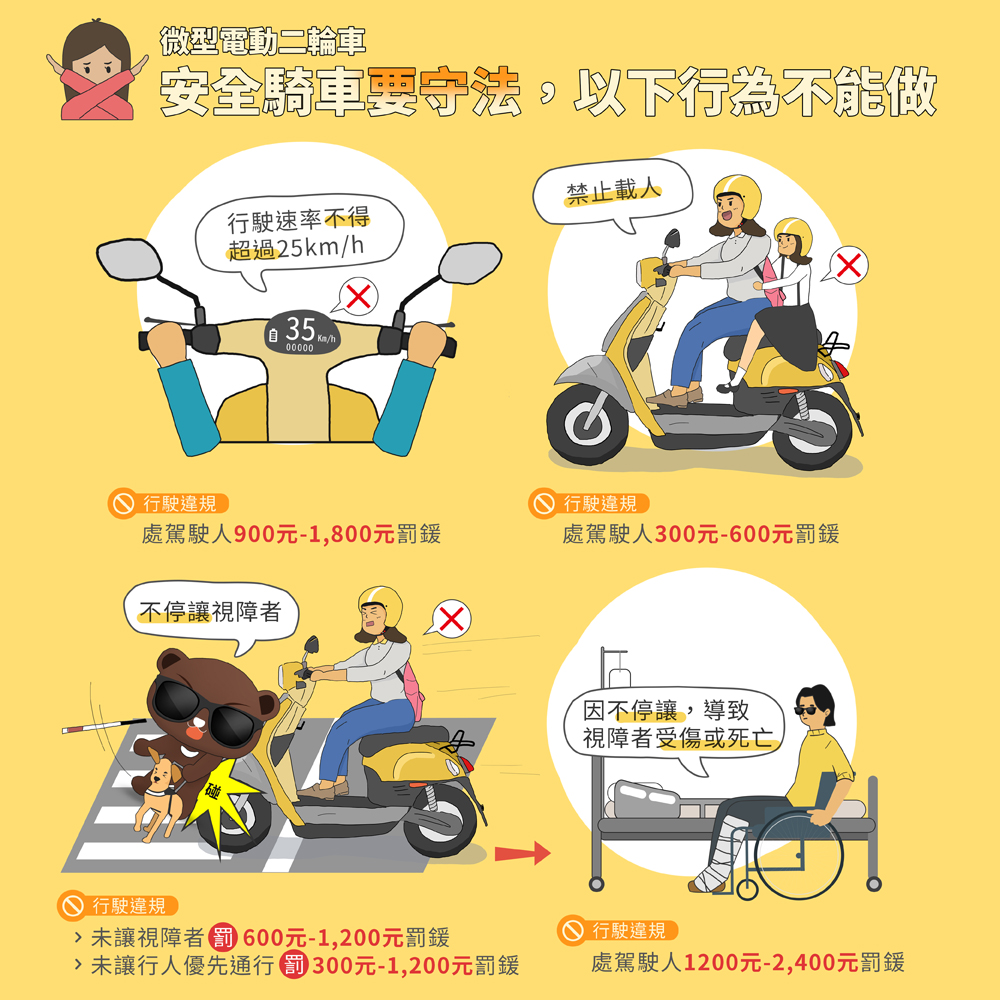 微型電動二輪車因為操作簡單、價格親民,又能輕鬆應付短程代步需求,成為許多民眾通勤、接送孩子的新選擇。騎乘微型電動二輪車時,最常見的違規行為包括:沒戴安全帽、未依規定停車、載乘客、騎在人行道,以及不遵守號誌或標線。除了遵守交通規則外,騎乘者須 年滿14歲,行駛時務必戴安全帽,車速不能超過 每小時25公里,也不能自行改裝車輛。